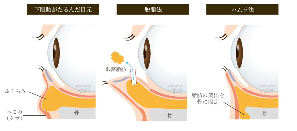 ハムラ法とは目の下の余分な脂肪を除去すると同時に、余分な脂肪を目の下の方に逃がしながら固定することで、