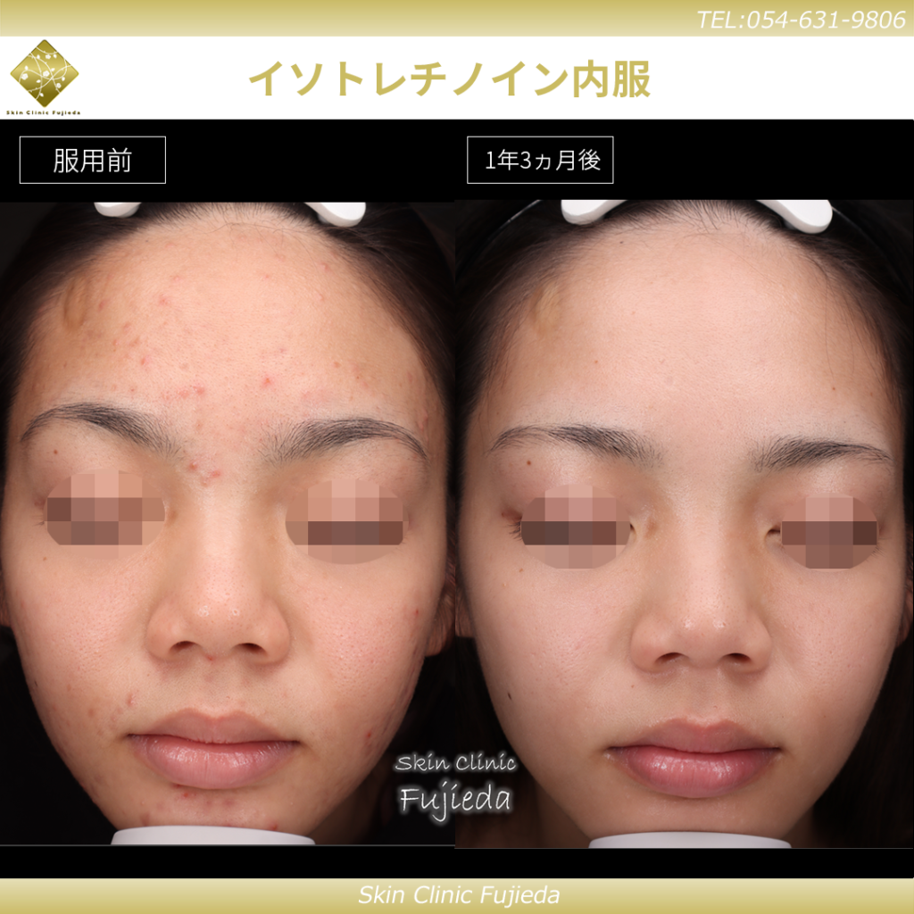 ビタミンA誘導体の一種で、皮脂分泌の抑制、毛穴の詰まりの改善、アクネ菌の増殖抑制、抗炎症作用により、重度・難治性のニキビ(尋常性ざ瘡)に対して非常に高い効果を発揮する内服薬です。