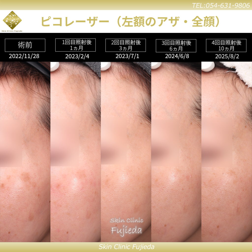 左前額のアザは4回照射、全顔のシミには2回照射を行いました。