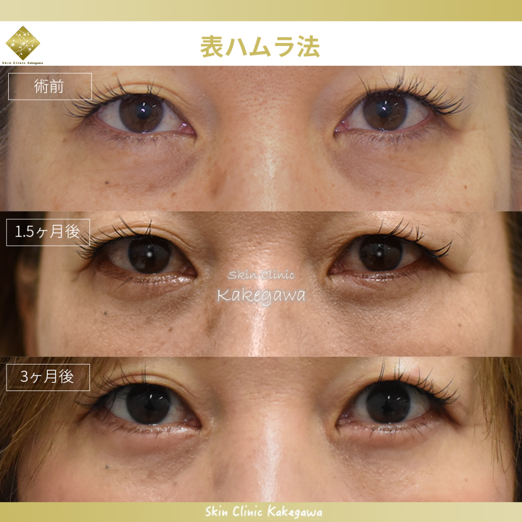 表ハムラ法は下まぶたを皮膚側から切開し脂肪を移動、余剰皮膚や筋のゆるみも同時に整えるためたるみが強い人に向いていますが、